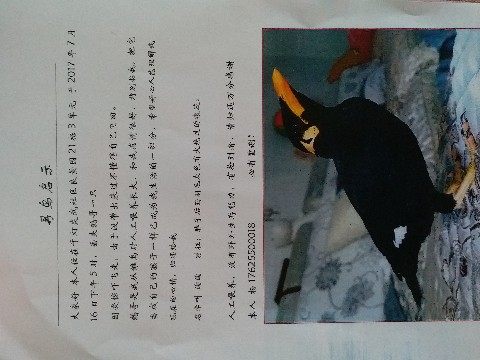 本人住在千灯炎武社区良景园。于2017年7月16日下午5时,丢失鹩哥一只 因受惊吓飞走,由于没带出来过不懂得自己飞回。 鹩哥是我从雏鸟时人工喂养长大,和我感情很好,把它当成自己的孩子一样特别粘我,希望好心人能理解我现在的心情, 人工喂养,没有野外生存能力,有捡到者,请归还 本人 杨17625500018 必有重谢!感激不尽!