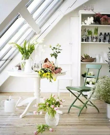 室内绿化除了单独落地布置外,还可与家具、陈设、灯具等室内物件结合布置,相得益彰,组成有机整体。如结合组合柜布置绿化、结合吊灯布置绿化等。把又白色郁金香、菊花和杂色常春藤组成的花丛,放在玻璃茶几下面,透过玻璃看到各种颜色,也可谓别出心裁。