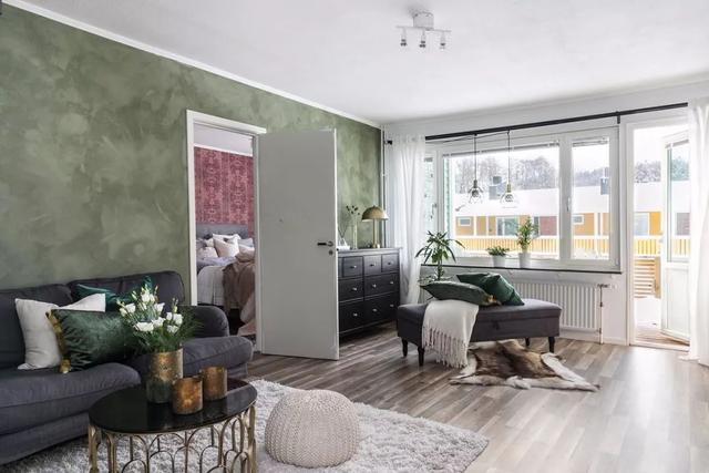 在这里,起居室尽管没有强烈的颜色,却被温馨的灰绿色所笼罩,墙漆斑驳而略微粗糙的质感使它看起来更加舒适、宜居,挣脱掉对于北欧风格一尘不染毕恭毕敬的束缚感,让居住者感觉自由和洒脱。月光色拼木条地板意在呼应墙壁的感觉,家具仍然采用灰色调——钢灰色的沙发、长椅、黑色的电视柜和边桌,但设计者引入古典绿色的抱枕和不同种类的绿植来装点空间,增添了生机。