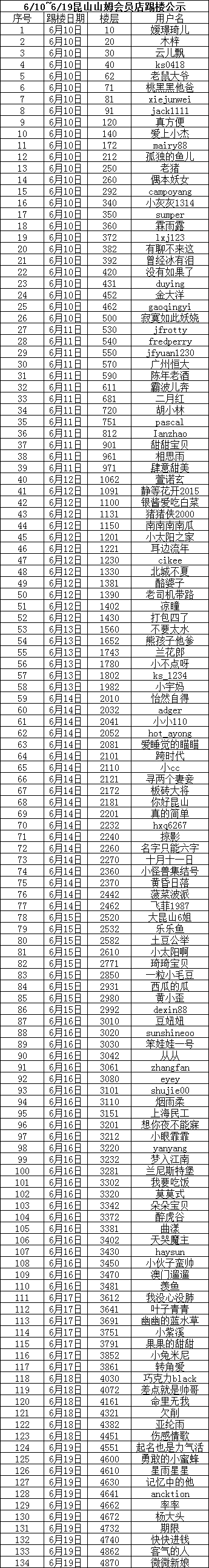 说明:每个ID只有一次中奖机会,多次中奖的ID以第一次中奖楼数为准。