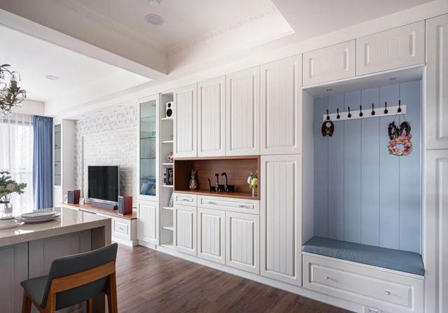 将靠近客厅的收纳柜的一侧设计成卡座,不仅满足了收纳,还能做一个休闲区域,是不是非常是安逸。
