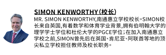 那么TA会怎么做呢?“中国特色”一定是关键词。双语教育绝不能照搬西方模式,而应该在中国课程的基础上,再博采众长。Simon校长将带着他几十年私校的教育经验,再与惠灵顿(中国)教育集团扎根中国10余年的积淀相融合,打造全新的南通惠立学校。