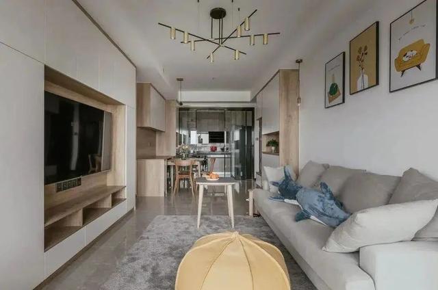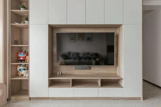 取消传统电视墙设计,直接整面墙打柜子,原木色与白色交替,有层次进深感。开放式与封闭式结合,避免整面白色带来的视觉单调,开放展示区,摆放一些玩偶和小饰品,又可以变成背景墙端景。