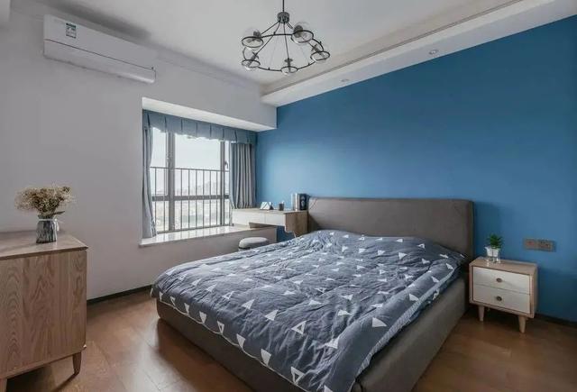 主卧延续简洁的格调,一抹蓝色背景墙设计,非常的亮眼。利用蓝色色彩特性,塑造空间静谧氛围。衣柜采用定制设计,纯白衣柜门板,加上无门把手的设计,让空间更显整洁宽松。