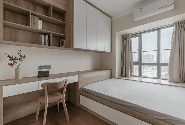 书房整体采用定制设计,榻榻米书桌一体,视觉整体感更好。连接书桌的床头靠背,做了上掀式储物,方便收纳一些小物件。吊柜和电视柜一样,封闭式与开放式组合,避免呆板又增加了使用灵活性。