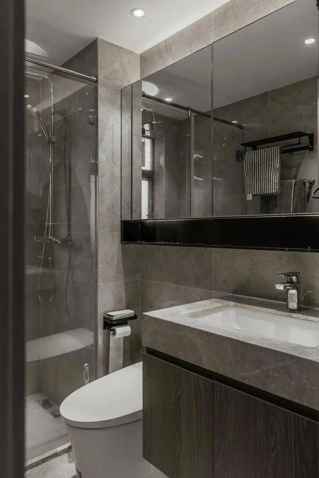 卫生间以酒店风打造,通铺灰色瓷砖,质感满满。空间比较局促,浴室柜尺寸采用定制,悬挂安装方式,增加了空间通透和柜子使用寿命。镜柜辅助收纳,顶部安装了灯带辅助照明。