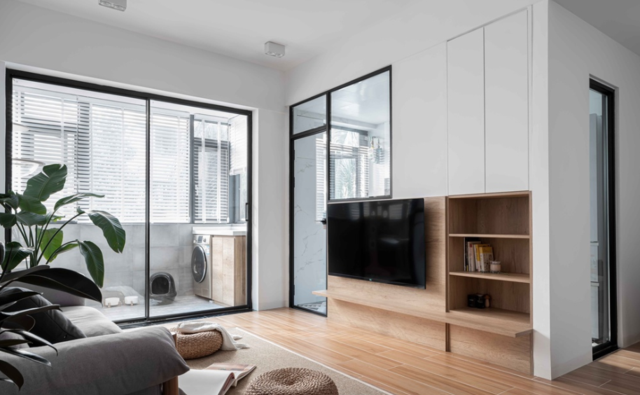 ▲电视背景墙上开了新的窄边框门窗,在视线上可以增加厨房与客厅间的通透性。阳台封窗,将其纳入室内空间;但我们依旧在客厅与阳台之间加了窄框玻璃门,因为屋主想有效的管理两只猫大人平时的卫生与气味。