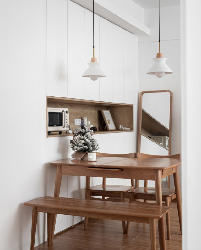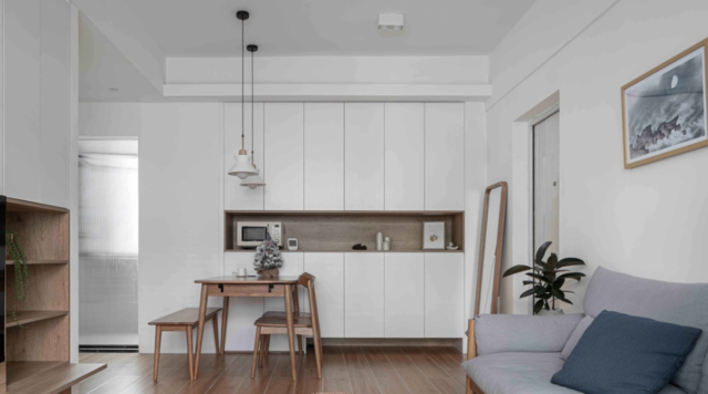 ▲餐边柜采用“一体嵌入式”设计,不会让柜子突出;顶天立地的一整面大柜子极大增加小户型的收纳。