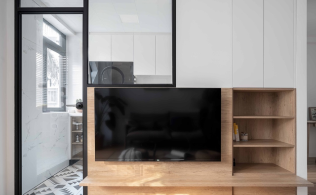 ▲电视背景墙上的窗户可以一眼望进厨房,增强空间通途效果,让之前小小的客厅,没那么封闭。所谓“空间的流动,视觉的流通”。