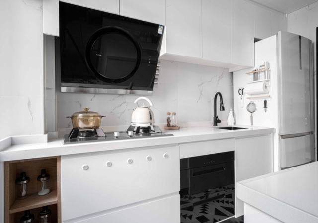 ▲厨房用白色作为主基调,黑色抽烟机+水龙头+洗碗机等黑色物品为点缀。经典的白+黑碰撞在一起,简单纯粹。