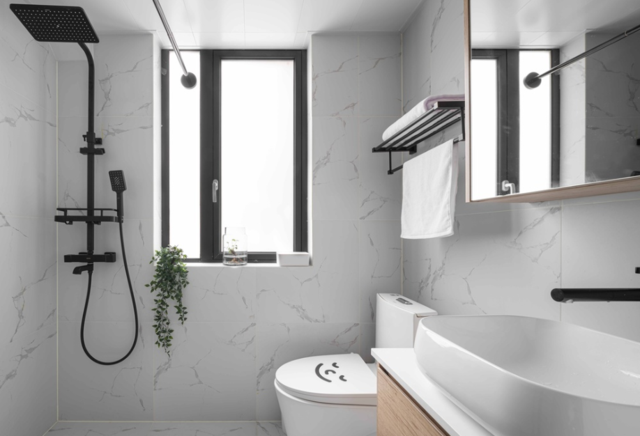 ▲卫生门用的是窄框推拉门+长虹玻璃。置物架用来放衣服毛巾都很方便,好放好拿。