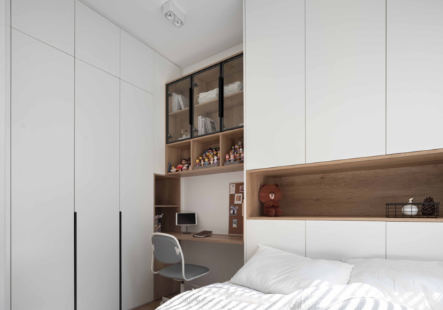 ▲榻榻米+书桌+书柜+衣柜一体式的设计,最大程度增加收纳空间。你睡你的,我看我的...