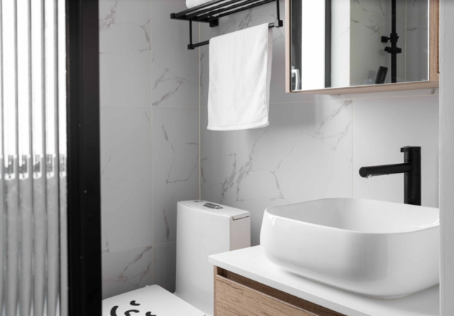 ▲卫生间的镜子是直接装在吊柜的柜门上,一物两用,节省了很多空间。