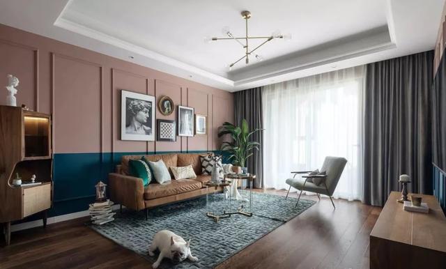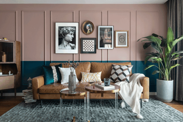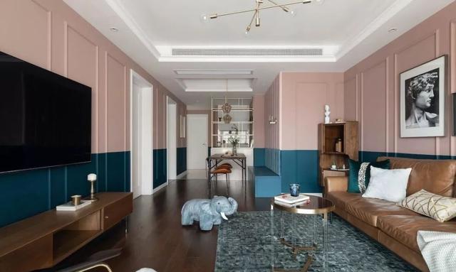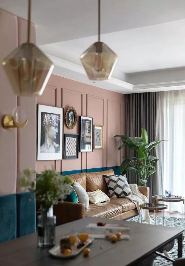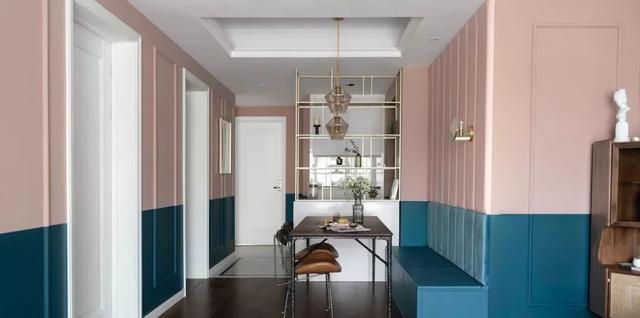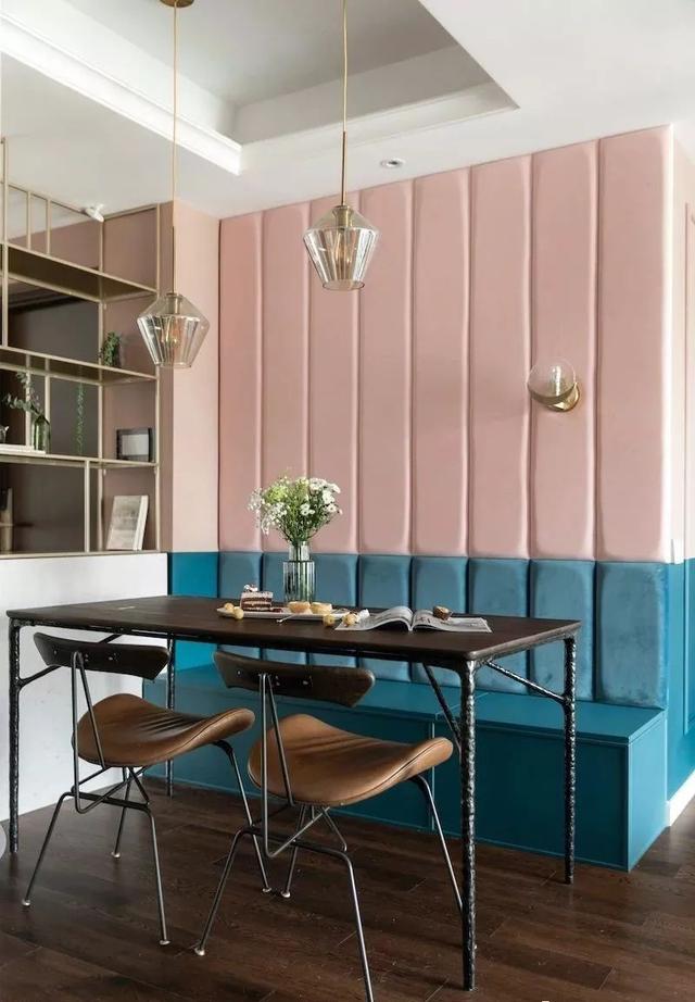 客餐厅的背景墙采用统一的色彩装饰,保证格调的一致性。粉色与孔雀蓝的撞色,高雅柔美。餐厅背景做了软包,大大提升了空间的舒适感。