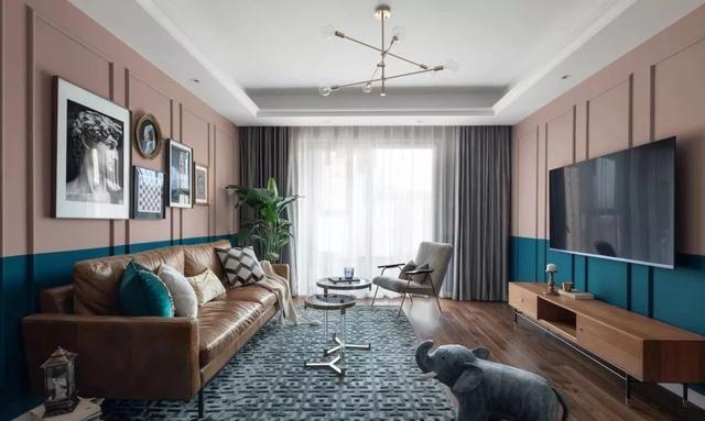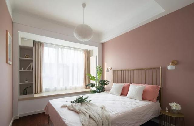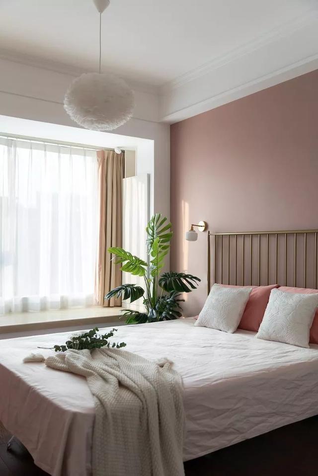 儿童房墙面则是清新的粉红色,与客厅的脏粉色里外形成呼应。白色的羽毛吊灯,增添了整个空间的柔美感。