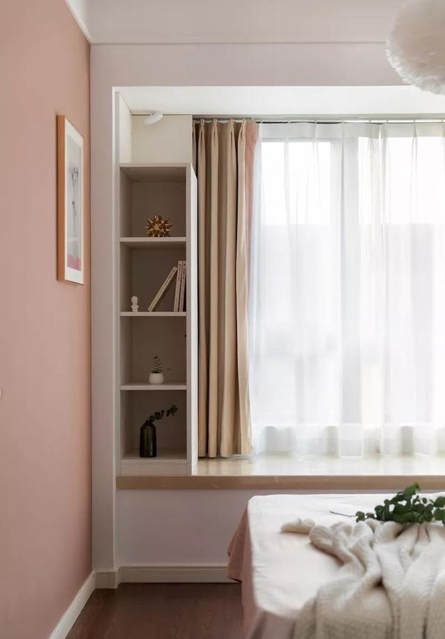 同样利用飘窗增加了储物柜,开放式的柜子用于放书籍、摆件都是很不错的。