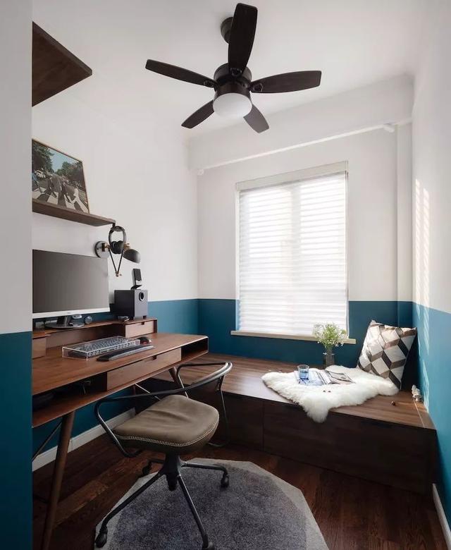 书房延续了客厅的孔雀蓝色,搭配胡桃木定制家具,宁静优雅而又充满自然复古的味道。