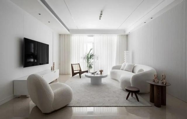 沙发墙以白色长城板为装饰背景,摆上外形带有弧线的优雅米白色沙发,结合白色圆形茶几,地面铺设浅灰色布艺地毯,整个空间都充满了简雅高级的气质。