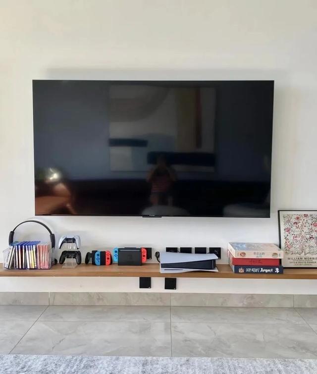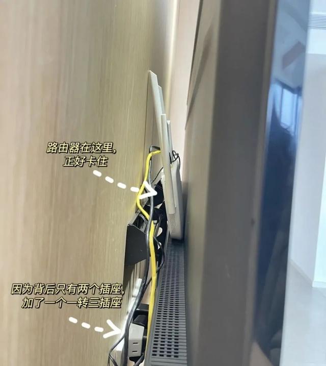 如果你家电视的款式是上薄下厚,那么我们就刚好可以利用这一特点,将路由器机顶盒等这些电器都放置在电视与墙的交接面上。