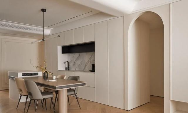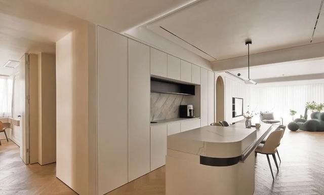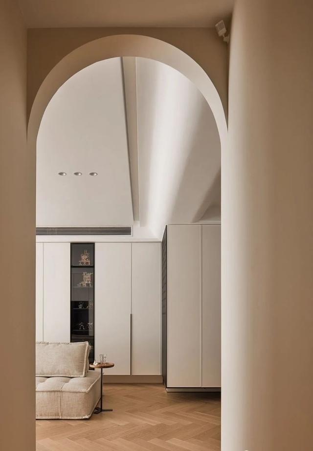 弧形吊顶自然过渡,一扇伪装成柜门的隐形门将家务区和晾晒区隐于客厅以外。