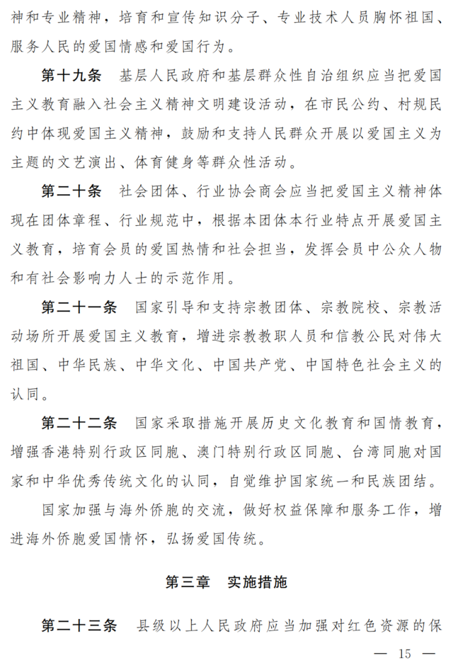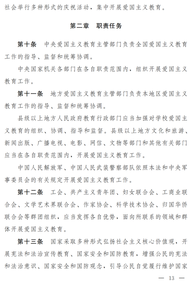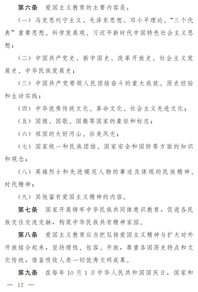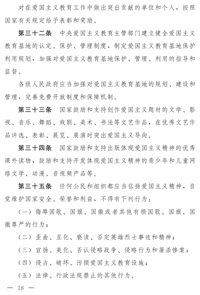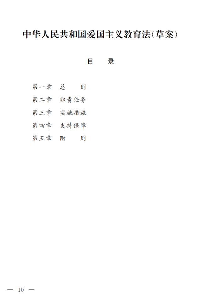 草案共5章38条,主要内容涉及爱国主义教育的内涵目标、指导思想和总体要求、领导体制和工作原则、内容、部门职责、教育对象、实施措施以及支持保障等。