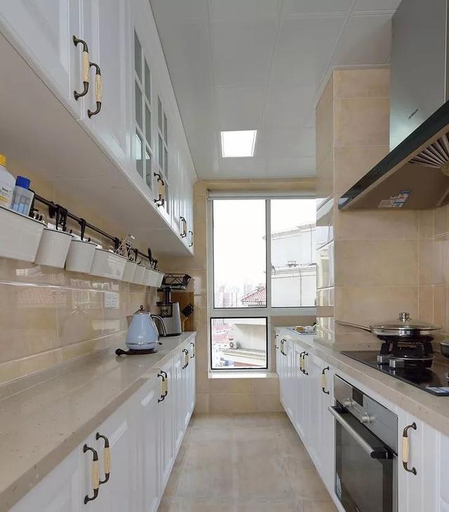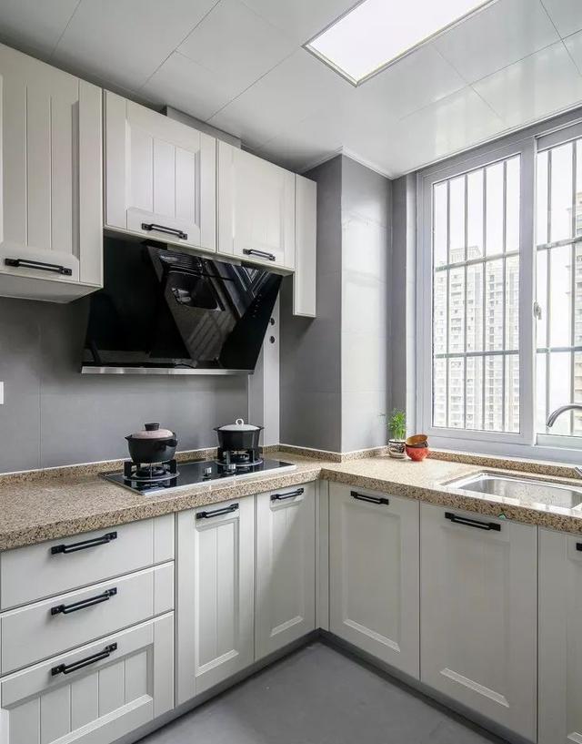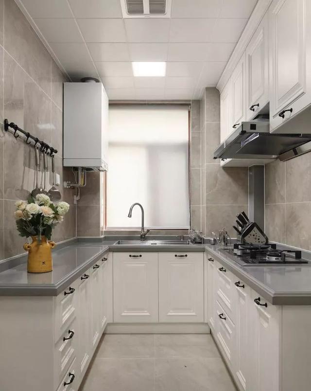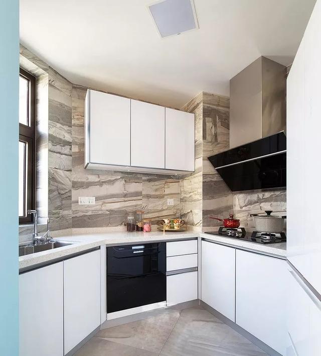 ▼一般的厨房都偏长,而长方形厨房较为适合设计L型橱柜,这样不仅空间利用率直线飙升,还能留出空间给业主适配各种厨房家电,增强厨房的兼容性。