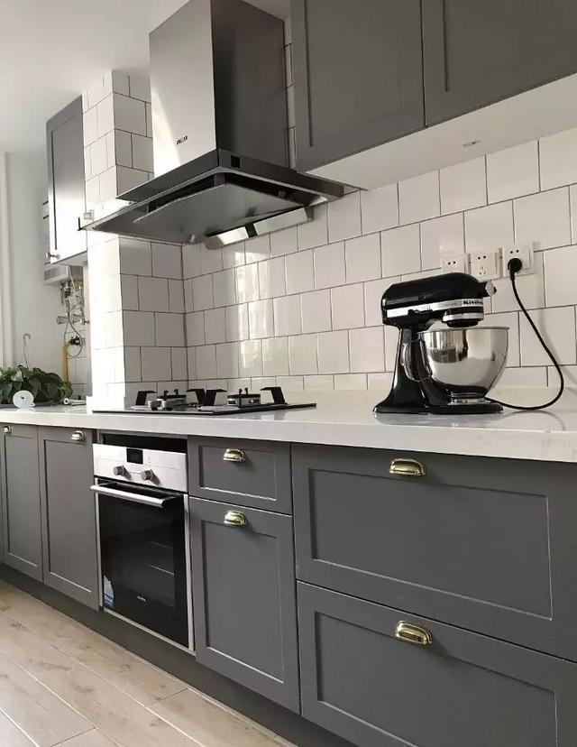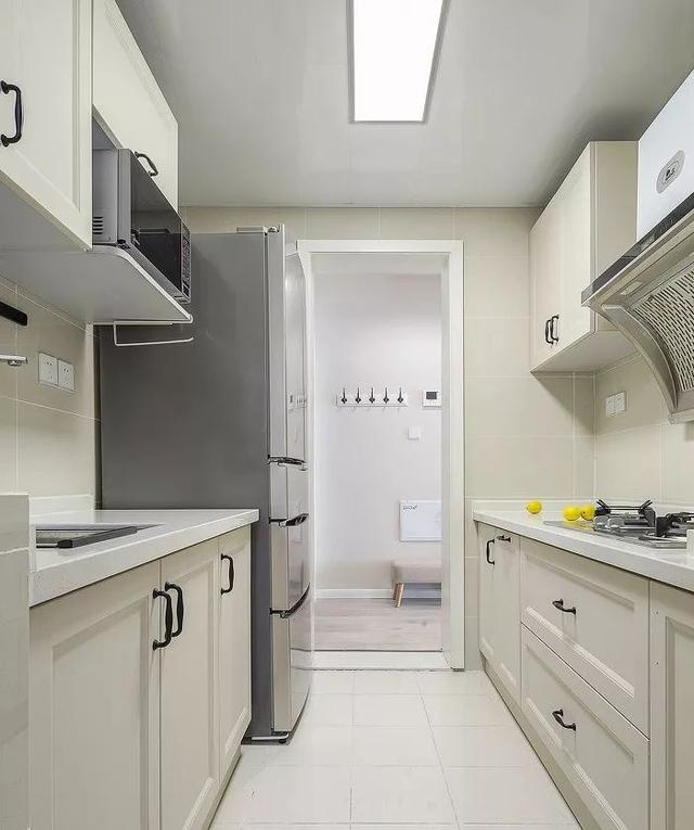▼如果厨房属于面积狭小的狭长型,建议使用一字型布局。可以在角落留出一个冰箱的尺寸,将冰箱和橱柜融合。担心收纳性能较弱的话,可以多做墙柜哦。