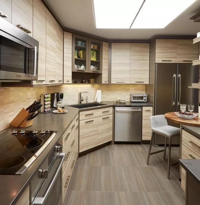 ▼厨房面积较大,并且呈现方形的话,建议将厨房设计成U型,这样不仅可以容纳更多的电器、厨具等,几个人同时下厨也不会感觉很拥挤。