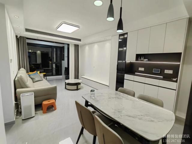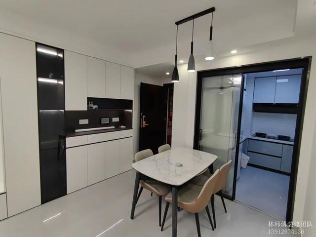 入户是餐厅,黑白餐边柜经典有格调,黑色橱柜暗藏灯带,更好看。细脚岩板餐桌,简约精致,吊灯的设计将用餐氛围感拉满。
