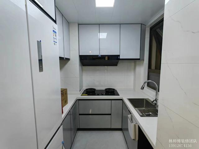 厨房面积不大,U型设计更节省空间,将收纳能力最大化。冰箱内嵌在厨房中,整体统一,不仅美观,也便于使用。