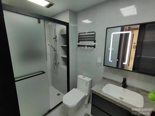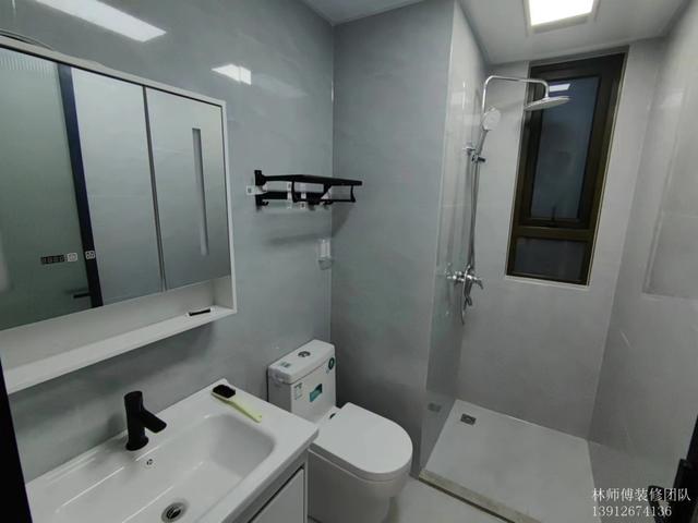 主卫的面积比较紧凑,整体浅色设计,看上去更清爽。淋浴房没有做移门,开放式设计省去了很多打扫的功夫。