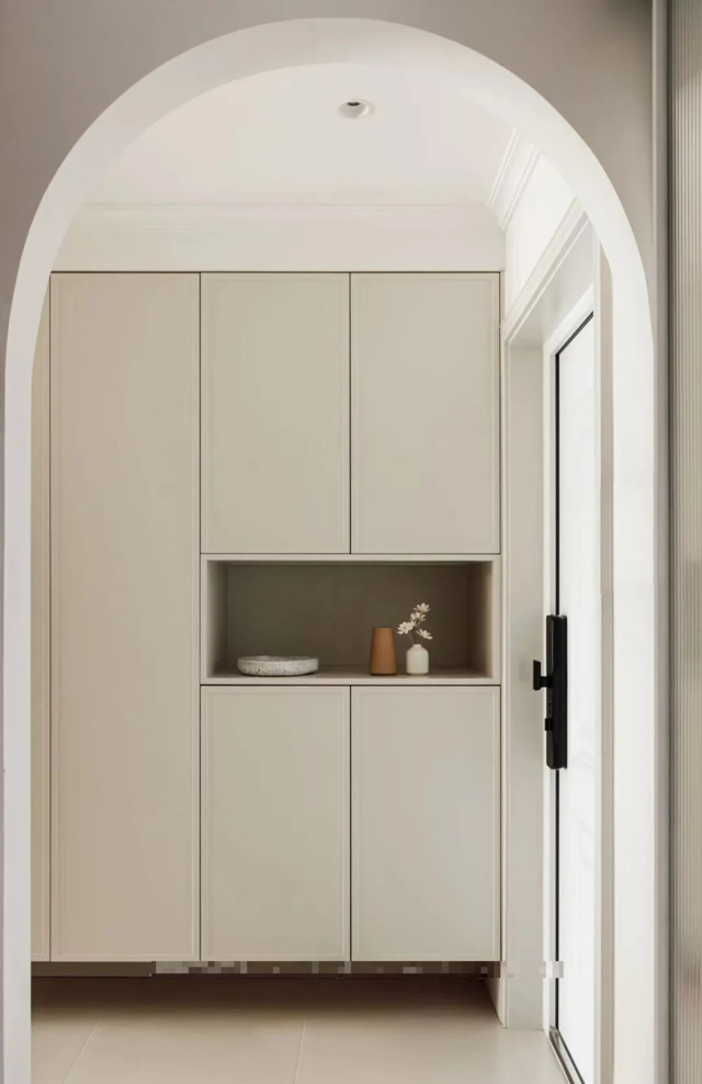 玄关区顺着墙做了整排组合收纳柜,回家放包包、挂衣服、脱鞋一气呵成。