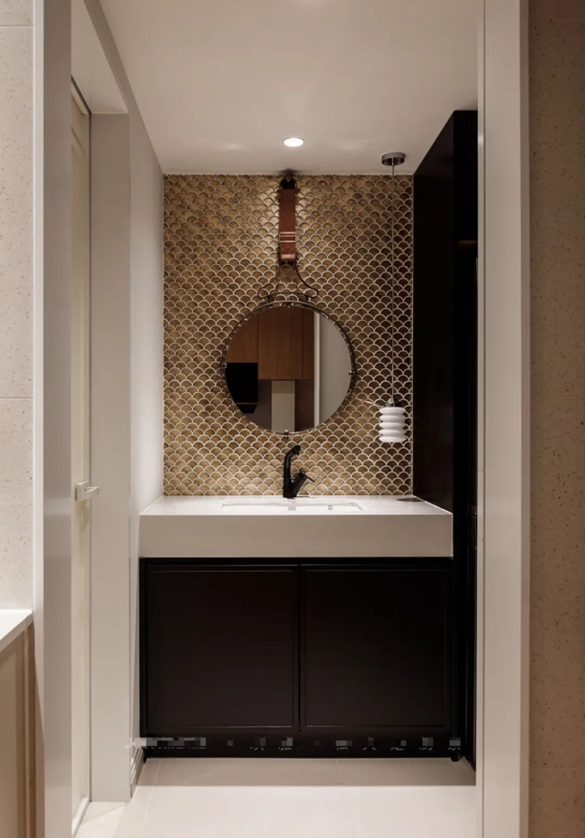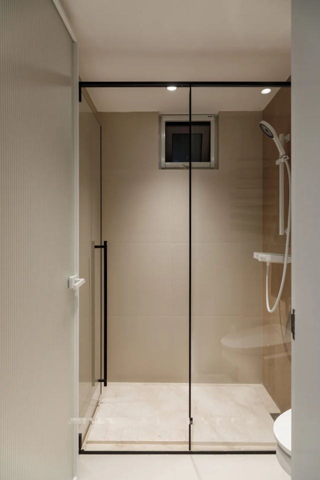 卫生间湿区只有一扇小窗,设计师选用了温暖干净的米色哑光瓷砖,外面是透光的长虹玻璃门,增加暗卫的通透感。