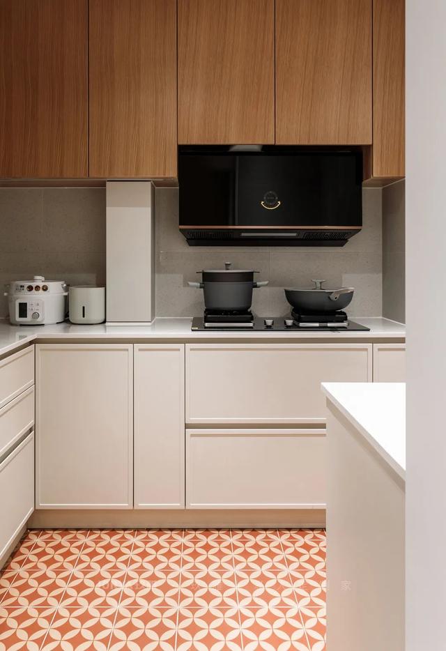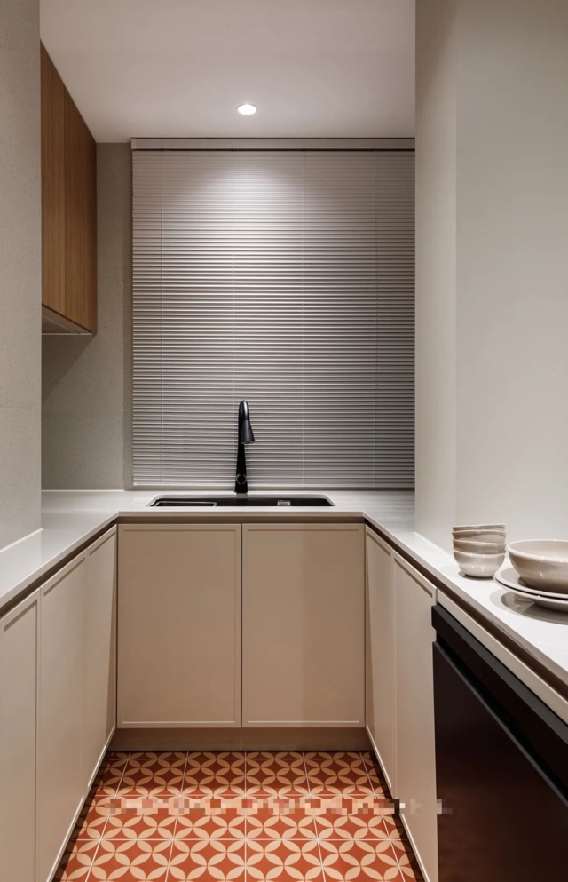 厨房推拉门也改到中间,台面不再是断开的二字型,而是连贯的回字型,使用起来也更加方便。