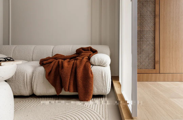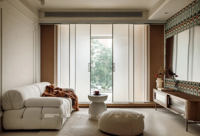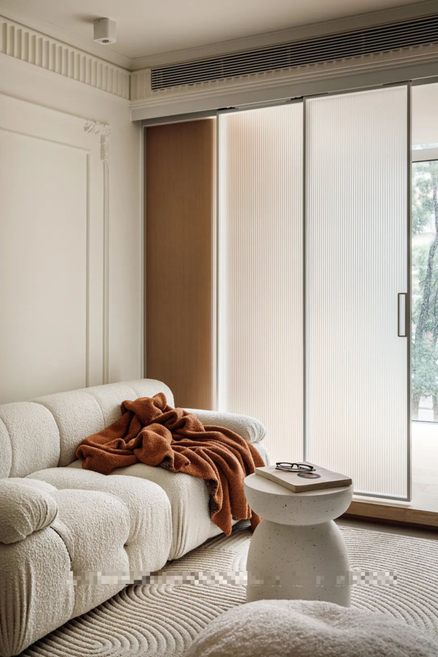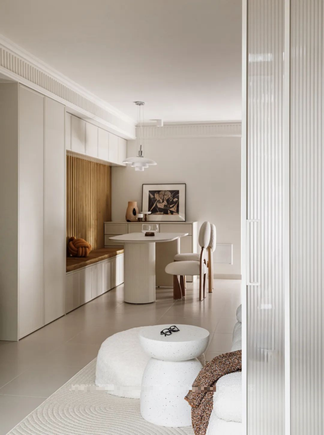 客厅增加了一间房,却没有拥挤的感觉。软装上,客厅的沙发、圆形小茶几都选用体量轻盈的乳白色。电视柜是细腿的,地台是悬挑的,让整个空间有了呼吸感。
