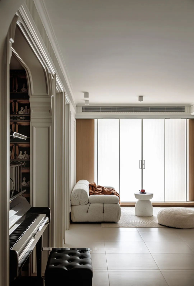 太太的钢琴角,用奶白色古典门套围合,墙面满贴墨绿色歌剧院壁纸,让这个小角落有了丰富的层次感。