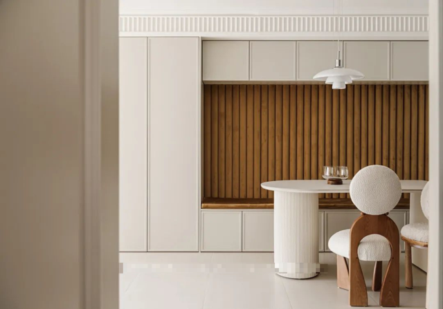 餐厅偏窄长,在靠墙一侧做了整排的丝绒卡座,相比单椅,卡座能坐更多人,也更省空间。