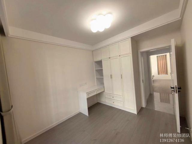 小房间的床还没有到,但是整体的布置还是不难看出的。衣柜延伸的书桌,连床头柜都省了。上方是开放式的格子,可以用来作为书架使用,拿取更方便。