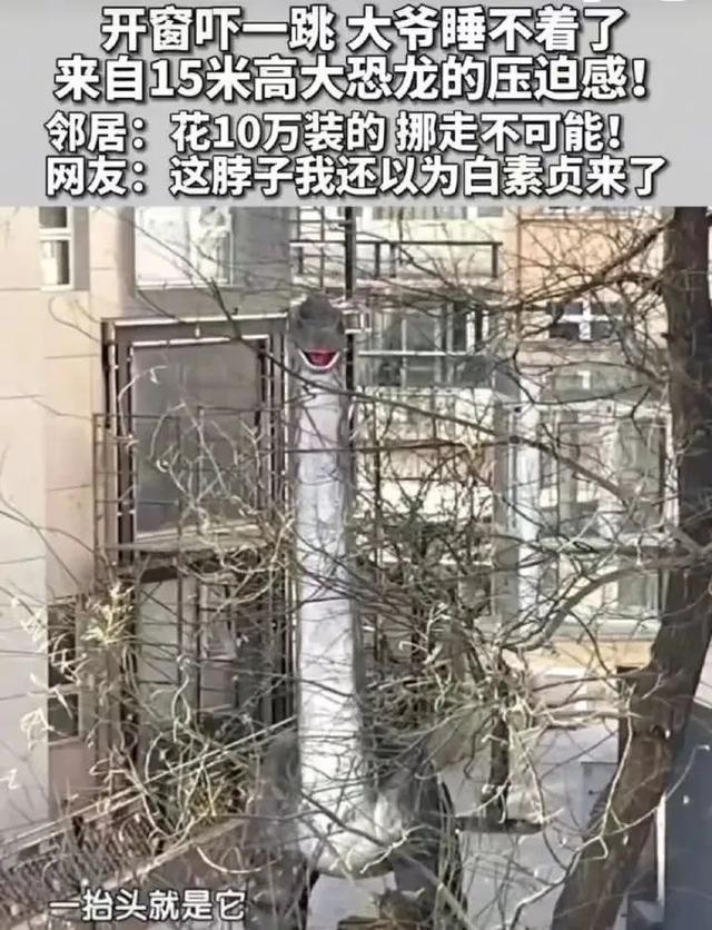 近日,北京某小区一业主花费10万元买了一部高15米的恐龙模型摆在小区院内。该小区有的住户兴致勃勃,特意“呼叫”了奥特曼,和不远处的恐龙模型合影,形成互动。但有的住户表示自己受到了惊吓,因为该恐龙模型的嘴部正好朝着自己家窗户,张着的大嘴带来了强烈的压迫感,每天看着都是一种“精神折磨”,吓得睡不着觉。