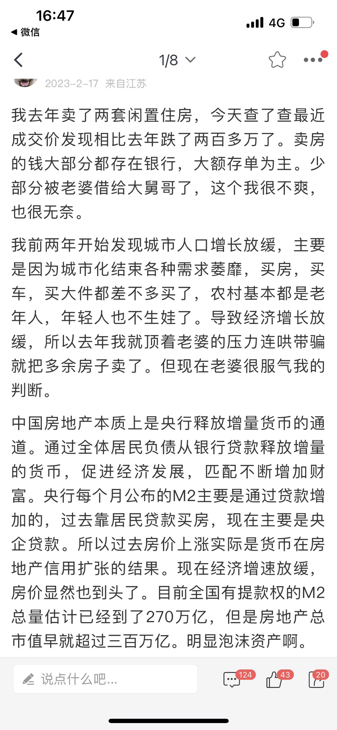 关于房价我要说这不是一个经济周期的事情了,是一个时代结束了。长期经济政策,供需关系和地缘ZZ博弈决定了房地产上涨时代的必然终结。接下来是存量资产争夺。股市,理财,房地产,新能源汽车都是收割工具。老百姓不要用在通胀转通缩的时期高消费,不要用通缩的资产消费通胀的物价,等物价跌下来再消费