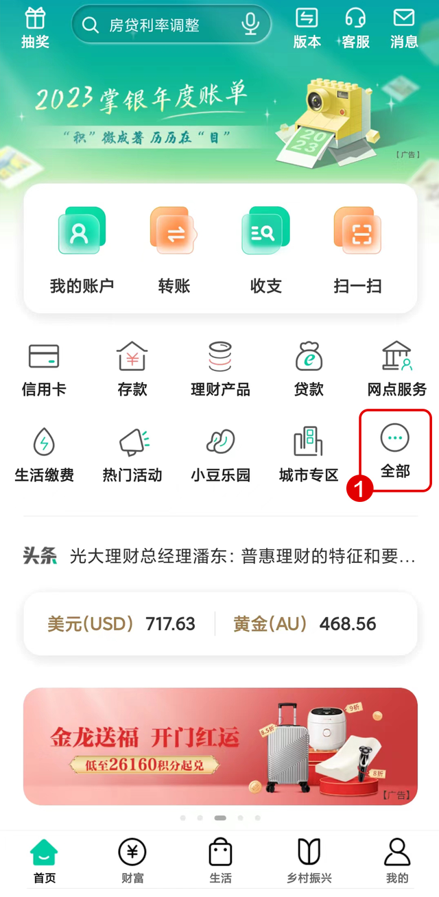 登录中国农业银行掌上银行APP,进入“首页”菜单栏,选择“全部-实物金”,进入贵金属商城首页。