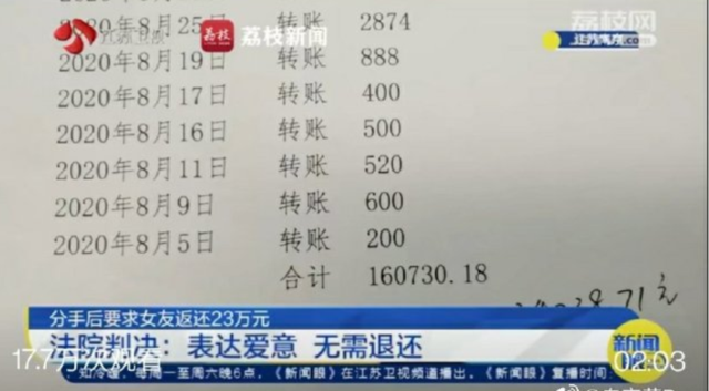 南京的李先生和杨女士恋爱不到1年,分手后李先生要求杨女士退还恋爱期间的23万多元转账,包括520元、1314元等特殊金额,遭拒后起诉至法院。