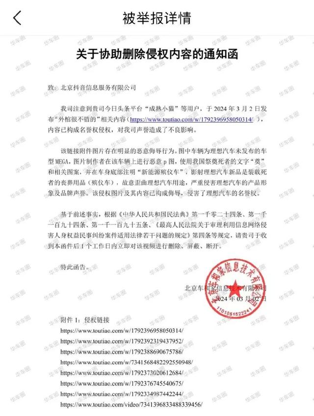 近日,一名汽车博主在网络上曝出一则理想汽车向某平台的投诉通知函。该通知函指出,2024年3月2日,今日头条平台“成熟小猫”等用户对理想汽车的新品MEGA车型进行恶意P图,将“奠”和“新能源殡仪车”等字样贴于车身,严重侵害理想汽车的产品形象及品牌声誉,侵害了理想汽车的名誉权。理想方面要求今日头条平台对相关内容作删除等处理。