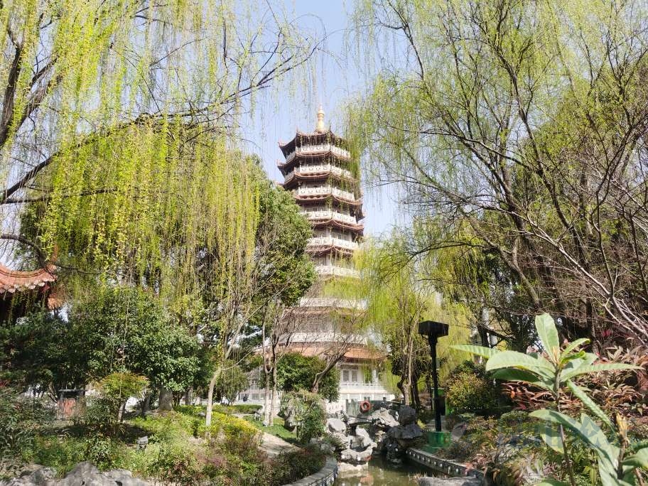 柔柔的柳枝在岸边随风荡漾,粉粉红红的花朵朝着天空肆意的绽放。