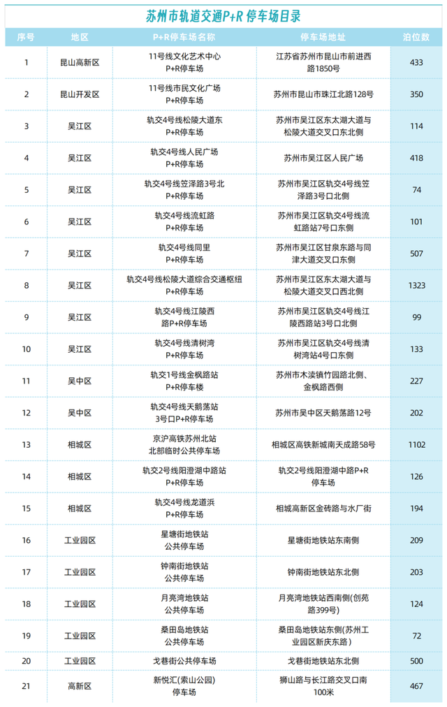 《关于更新调整苏州市轨道交通P+R停车场目录的通知》公布了新一批轨交P+R停车场目录,我市目前共有21个轨交P+R停车场。