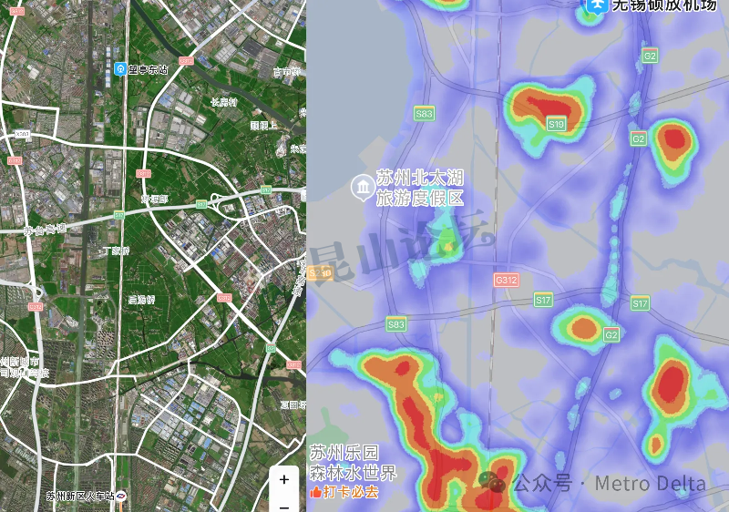 作为2022年苏锡一体化协议中的重要工程之一,按照本次规划线路的途径区域来看,应该是采用的无锡3号线对接苏州线路的方案。但是,按照卫星图和人口热力图结合此前的苏锡3号线对接线位来看,如果依然采用此前传言较多的铁路廊道北侧方案,可能会有沿线覆盖面人口水平较低,潜在客流强度评估可能不足以满足国家相关标准,且存在与规划苏锡常城际铁路功能重复的严重问题。前者可能也是本次规划并未提及具体线路号仅以“苏锡轨道快线”的原因之一。(按照国务院和发改委的相关文件规定,若按照地铁申报,初期客流强度需达到0.7万人次/公里,若按照市域线申报。初期客流强度需达到0.4万人次/公里)