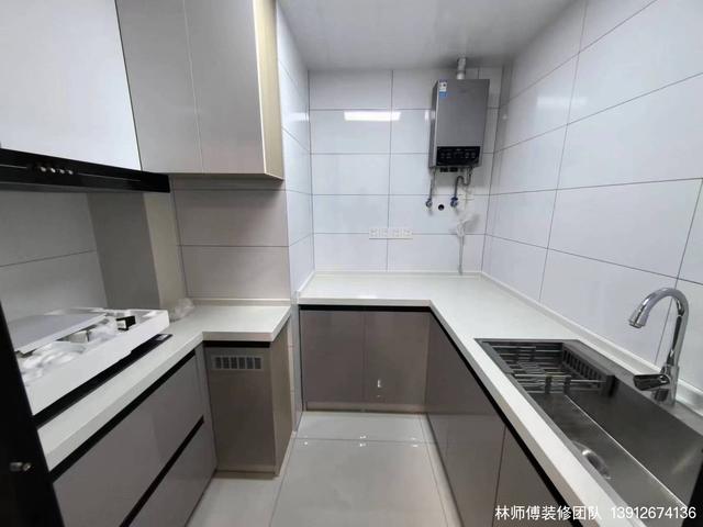 厨房空间不是很“正”,导致不能用常规的布局,因此,林师傅决定“因地制宜”,根据厨房的“不规则”特点,做了两个L布局的拼接设计,将空间尽可能的都利用起来,让收纳最大化。