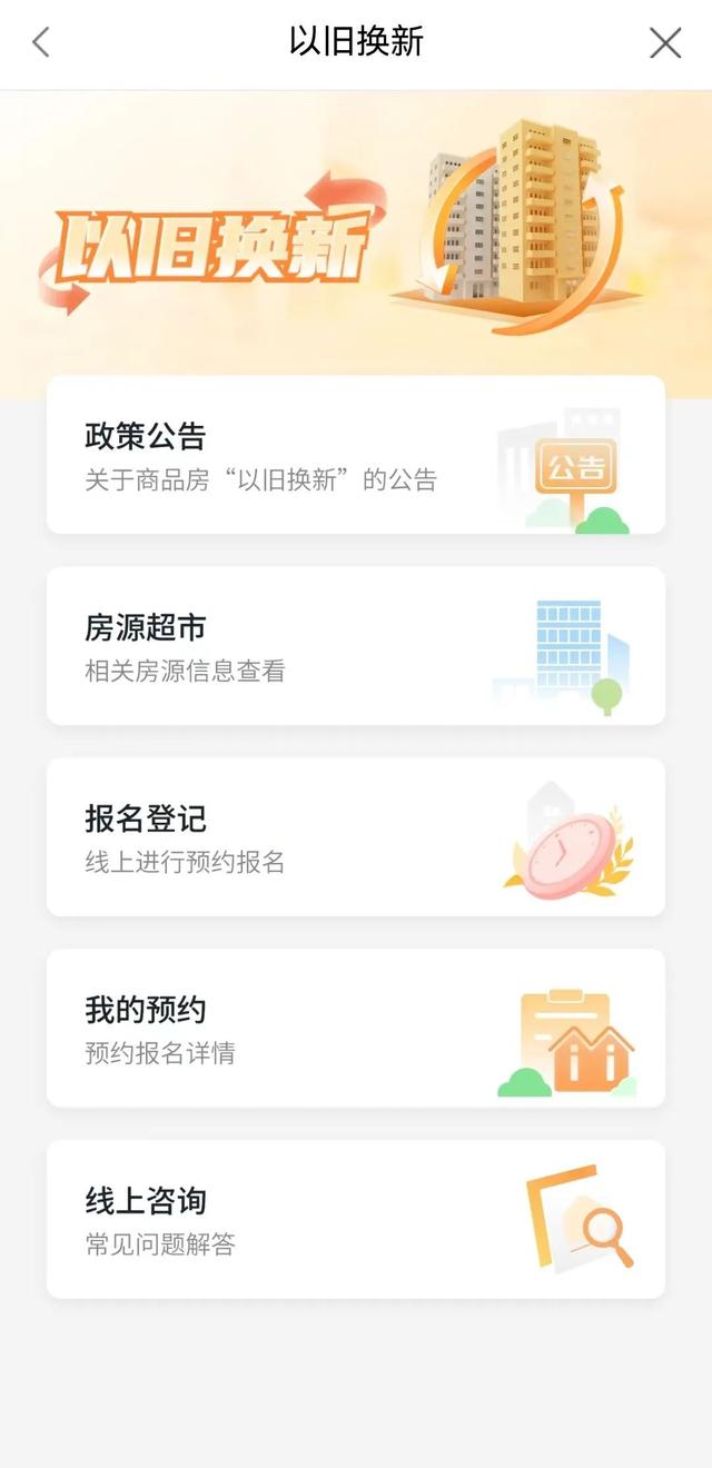 具体操作:进入“鹿路通APP”首页,搜索“以旧换新”,进入页面后,页面内容包括“政策公告”、“房源超市”、“报名登记”、“我的预约”和“线上咨询”五大模块。