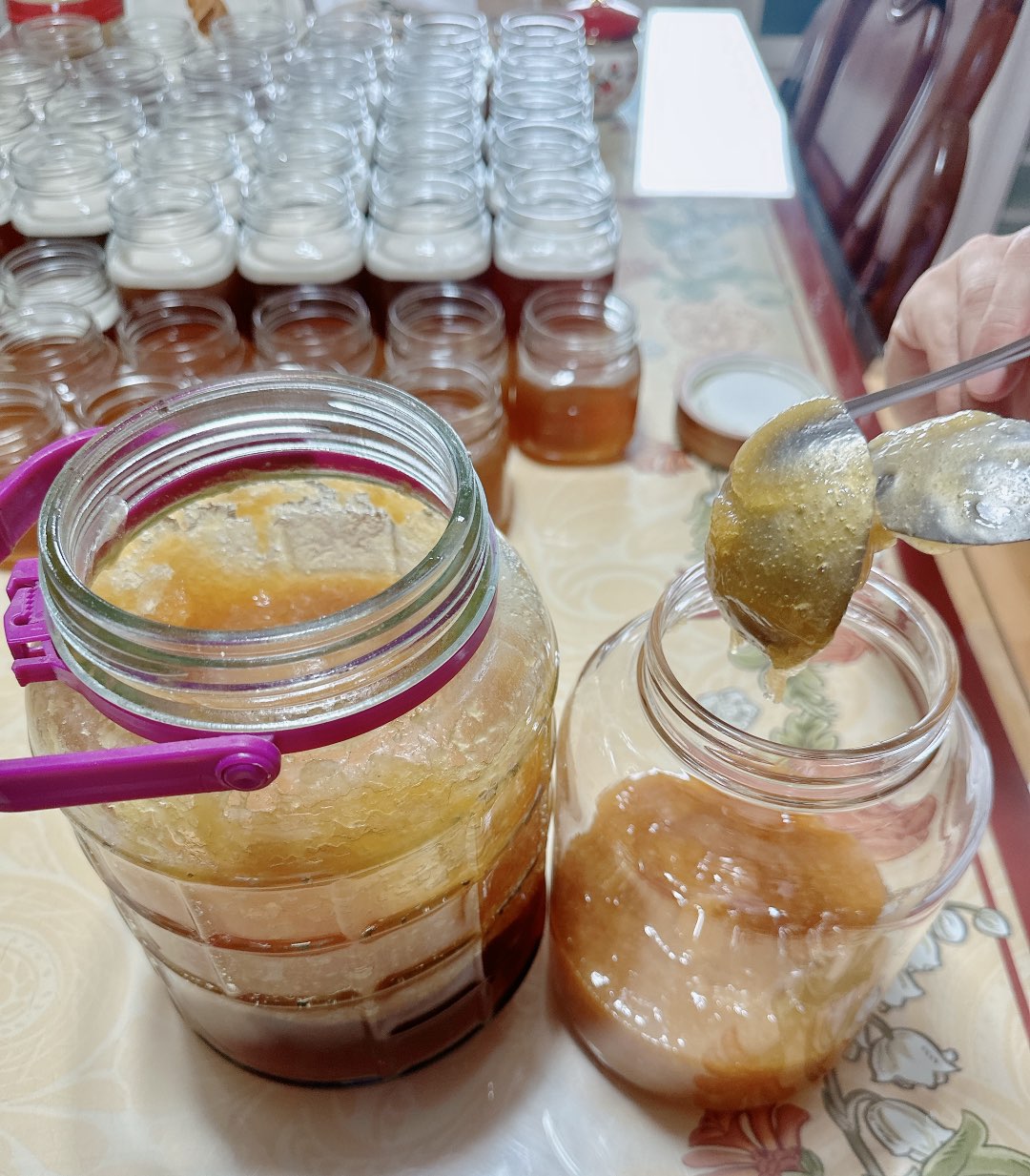 大姑姐家的都是今年前不久和前两天我们回去采摘的。我们带了一些今年和去年婆家采摘的蜂蜜,去年的蜂蜜是这种结晶的。
