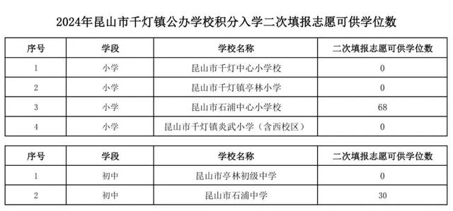 2024年昆山市千灯镇公办学校积分入学二次填报志愿可供学位数及准入名单公示